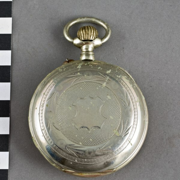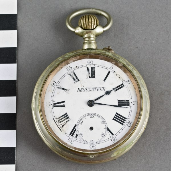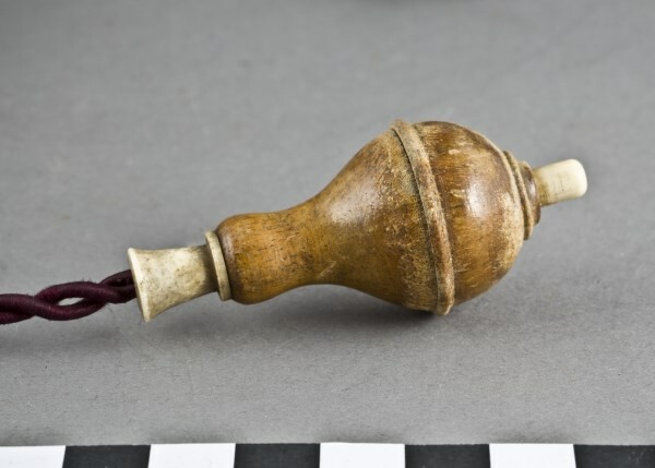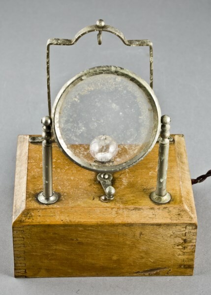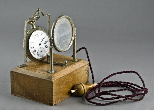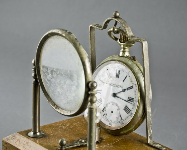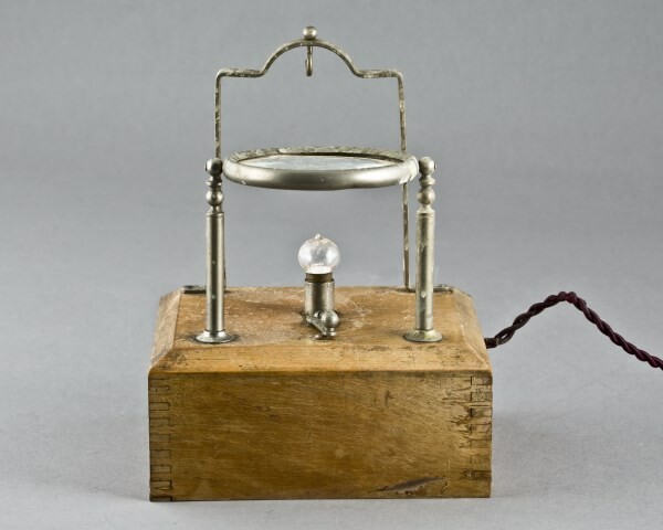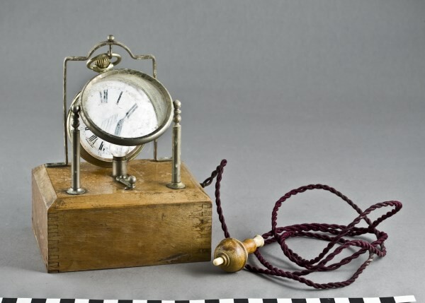 Uhrhalter mit Beleuchtung und Vergrößerungsglas, montiert auf einen Holzkasten (Batteriegehäuse). Lichtschalter aus Bein, gedrechselter Holzknauf. Zweipoliges Kabel mit Stoffisolierung. HBT 16 x 12 x 9,8, Kabellänge ca. 145 cm. Nicht dazugehörige Taschenuhr (zu groß), Frankreich