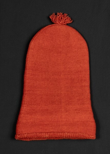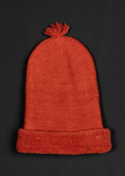 Rote Zipfelmütze mit kurzer Quaste. Die Mütze ist inwendig mit weißen Schlingen und im Stirnbereich mit rotem Plüsch versehen.