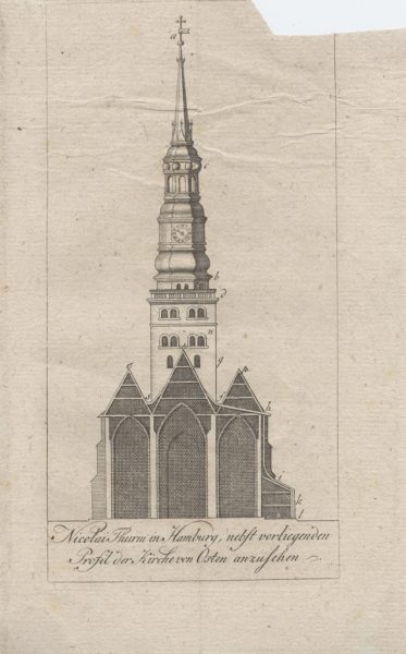 "Nikolai Turm in Hamburg, nebst vorliegenden Profil der Kirche von Osten anzusehen"