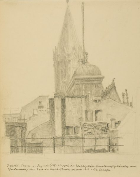 Beschriftung: handschriftlich mit Bleistift unter dem Bild: "Jakobi-Turm v. Jugend-Stil-Kuppel des Elektrizitäts-Verwaltungsgebäudes am Pferdemarkt; Vom Dach des Thalia-Theaters gesehen 1912. R. Schaefer.";