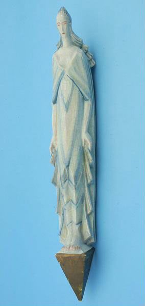 Form: Auf spitzem Sockel stehende weibliche Figur, deren Hände in das den Körper umgebende Gewand greifen. Die zackige Formgebung des Faltenwurfs am Gewandsaum wird bei den Haaren wiederholt. Die rückseitige Hänge-Vorrichtigung verweist auf die Konzeption als Wandfigur, vermutlich der Sammlung und Andacht dienend. Bemalung: Sockel goldfarben. Figur: auf hellem Fond, Falten- und Haarauswurf in zartem Blau/ Gelbgrün. Gesichtskonturen und Fußnägel rosa. Die Formgebung der Figur mit den stark überlängten, schmalen Proportionen und der äußerst markanten Konturierung durch Grate zeigt sich vom kristallinen Gotizismus beeinflusst.