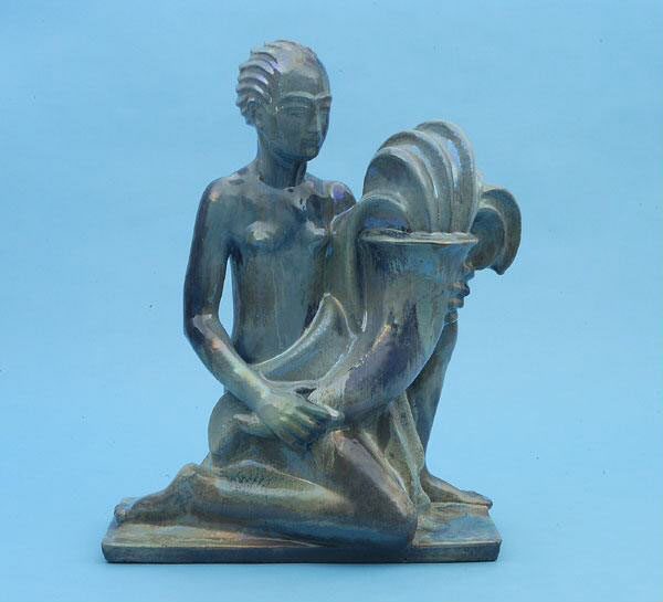 Form: Zwei zusammengehörende, spiegelsymmetrisch angeordnete, auf flachem Sockel kniende Frauenfiguren, die je ein großes Füllhorn in den Händen halten, aus denen Wasser strömt. Bemalung: Auf weißem Fond ausdrucksvolle, die Körperhaftigkeit betonende Glasur in den Farben Blau und Grün-Türkis. Farblose glänzende metallisch-changierende Glasur. Stilistisch verweisen die Figuren auf die auf Symbolhaftes reduzierte Formensprache der 1920er Jahre. Auch das durch die Figuren verkörperte Frauenbild - furchensträhnige, kurze Sturmfrisuren und androgynisierte Körper - entspricht dem damals gängigen Ideal. Die Figuren sind Unikate, sie werden nicht in den Netto-Preislisten geführt. Vermutlich sollten sie als dekorative Plastiken in einem Innenraum aufgestellt werden.