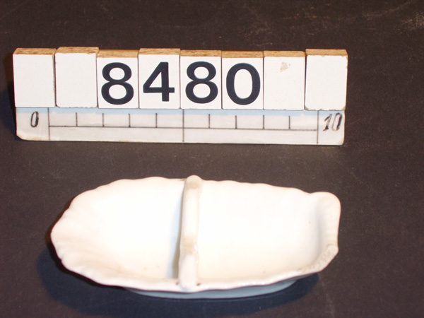 Ein ovaler Aschenbecher mit einem Holm zur Ablage der Rauchware in der Mitte. Er hat an einer Ecke einen abgeplatzten Rand. Er weist Gebrauchsspuren auf.