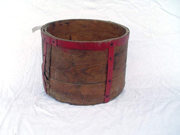An der Bodenunterseite 3 je 20cm zur Mitte als Verstärkung dienende Metallstreifen. Über den oberen Scheffelrand läuft in der Mitte eine Eisenstange, die wie ein T in der Mitte des Scheffels zum Boden verläuft. Daran kann man den Scheffel bewegen. An zwei Seiten sind in der Mitte am Außenrand zwei 5 cm im Durchmesser betragene Eisenringe angebracht.