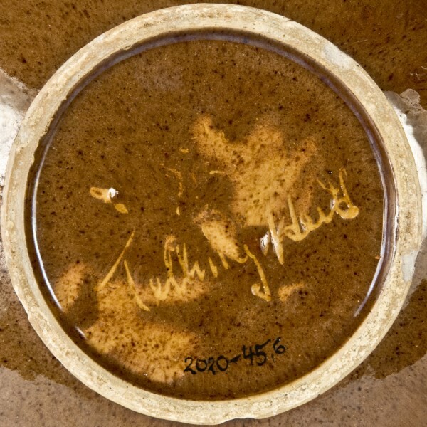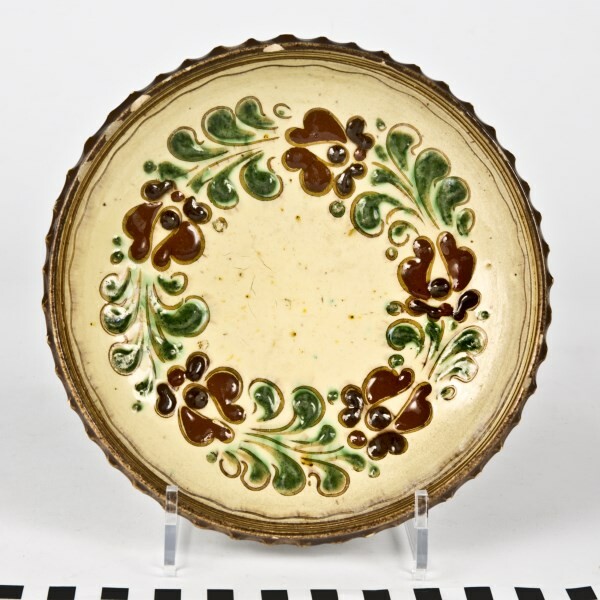 Innen wie außen bleiglasierte Irdenware, cremefarbener Scherben, hellgelber Anguss, unter der Glasur Ritz- und Malhorndekor in Braun, Rotorange (rötlicher Ocker) und Grün, außen braun glasiert.